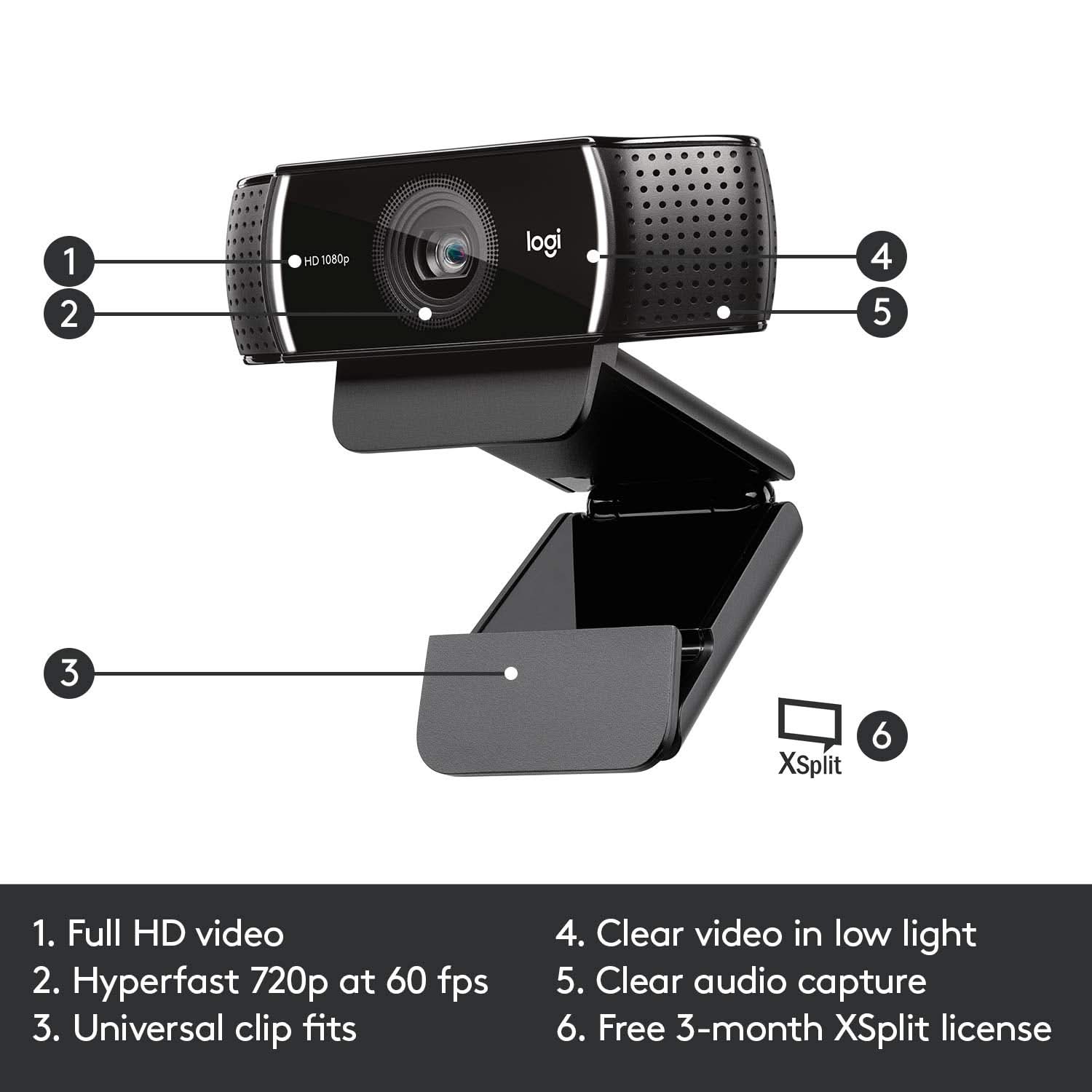 Logitech C922 Pro Stream Webcam, HD 1080p/30fps or HD 720p/60fps Hyperfast Streaming, Stereo Audio, HD Light Correction, Autofocus, for YouTube, Twitch, XSplit, PC/Mac/Laptop/MacBook/Tablet – Black Full HD 1080p at 30fps/720p at 60fps streaming Stream and